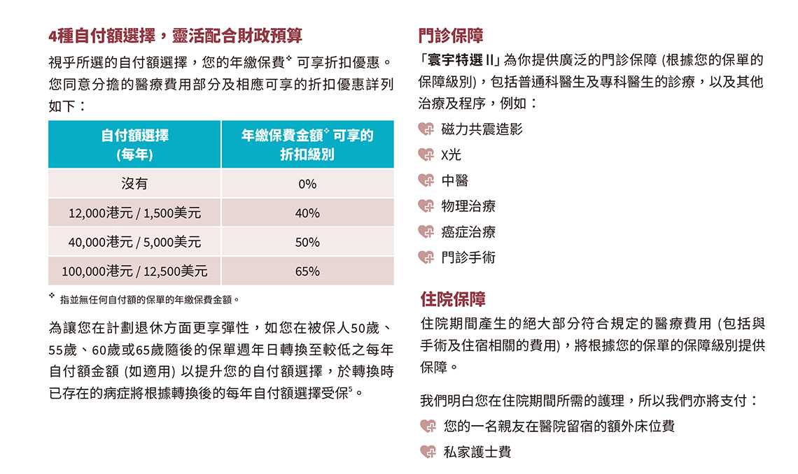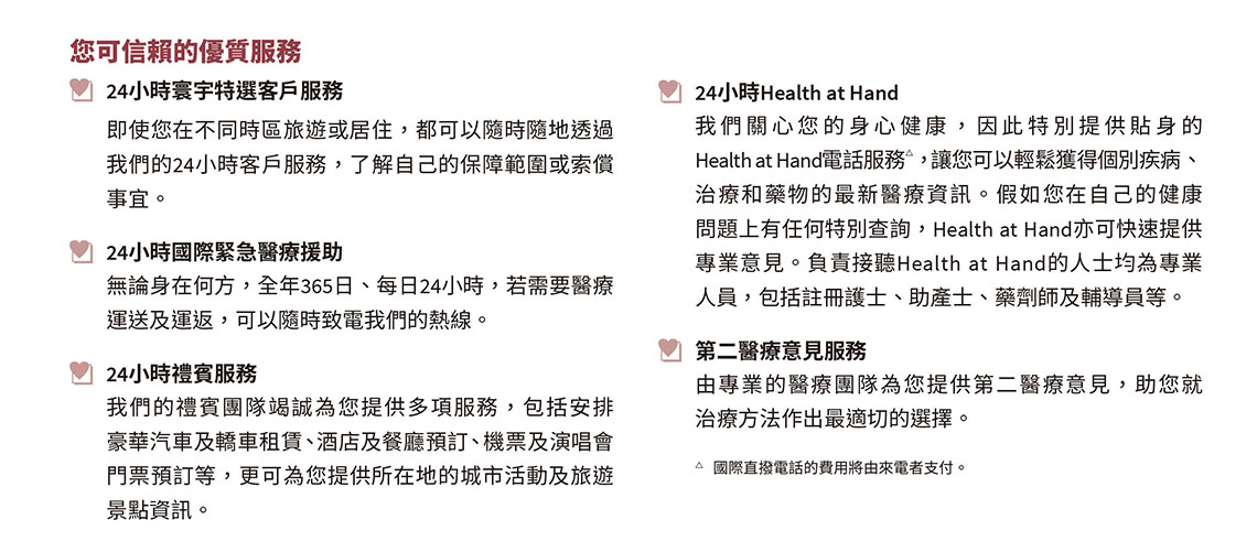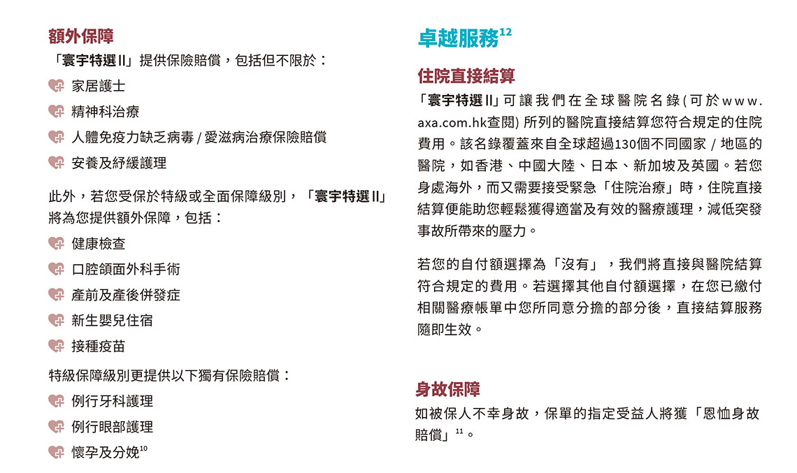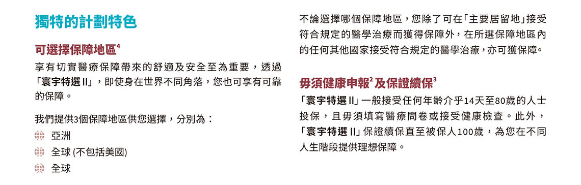 「寰宇特选 II 医疗计划」是安盛的高端医疗。高端医疗是身份的象征,怀揣一张全球通行的高端医疗卡,就等于拥有一张顶级的终身医疗护身符,终身享受保险公司与尖端医疗的保障,无论何时,身在何处,即使没有一分钱,也无须担心因突发疾病或意外得不到救助,也免去家人的担忧。