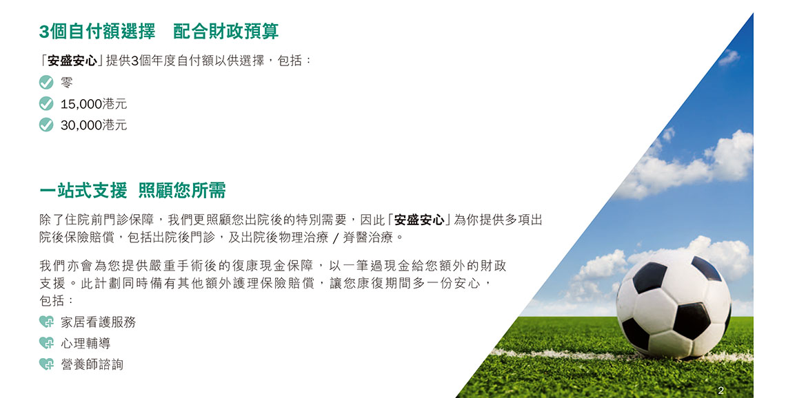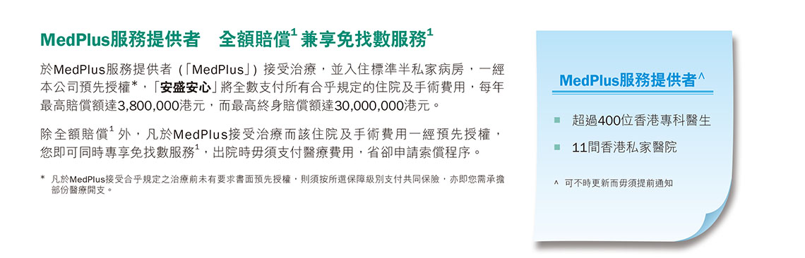 我们明白拥有优质的医疗保障至为重要、因此特意呈献安盛安心医疗计划,以相宜的保费为您提供卓越的医疗保障。此计划更提供方便快捷的免找数服务,让您安心休养,早日康复。