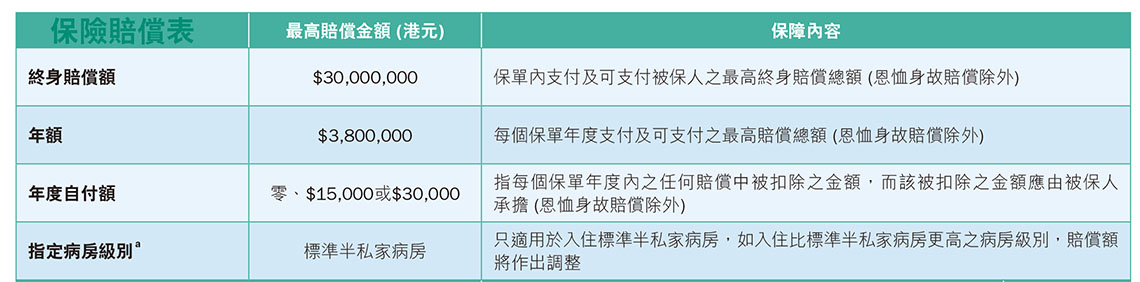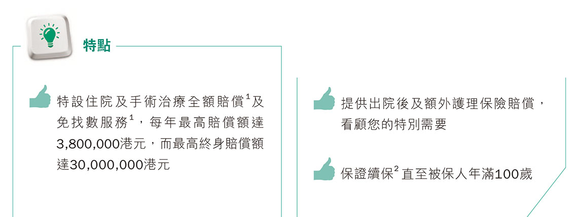 1.在全港11间私家医院特设住院及手术治疗全额赔偿及免找数服务2.灵活保障,提供三个每年自付额选择3.住院前及出院后,以及额外护理保障等一站式支援4.可于香港以至亚洲的任何专科医生或医院接受治疗5.终身保证续保