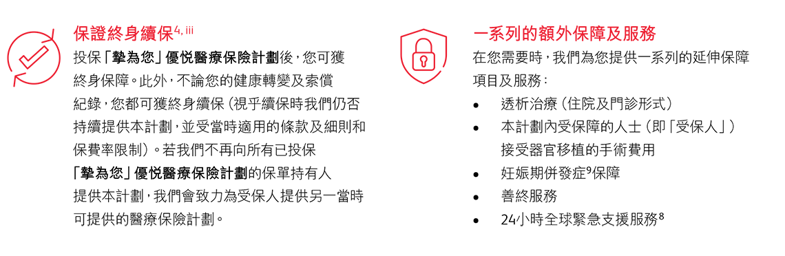 挚为您优悦医疗保险计划专为1-70岁(下次生日年龄)的尊贵客户提供周全的全球及终身医疗保障,最高赔偿金额达6,250,000美元/50,000,000港元。同时,您可以选择于计划上附加门诊、产科及牙科保障。我们为大部分住院保障项目提供全数赔偿,并保证终身续保,让您得到充分保障和轻松自在的生活。
