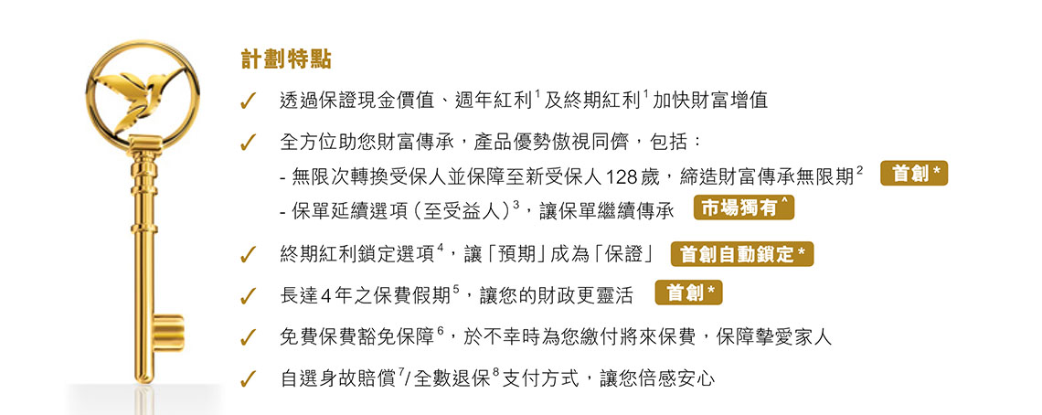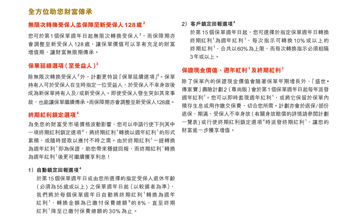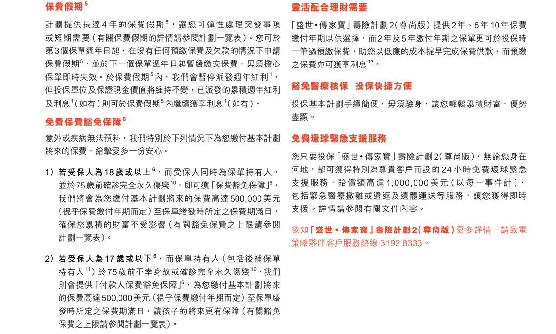 富通保险传家宝系列,是富通保险公司回归港资后升级的高回报储蓄分红产品,系列下各款储蓄寿险计划提供极具竞争力回报的优势产品。目前拥有港险市场上最高的年化收益率,同时保证回本时间最短,产品多样化,可以同时满足想要短期理财和长期规划理财的不同客户需求。1. 新增终期红利锁定回报选项,回报潜力高2. 保障至受保人128岁,可无限次转换受保人3. 保费假期,暂缓缴付保费4. 免费环球紧急支援服务