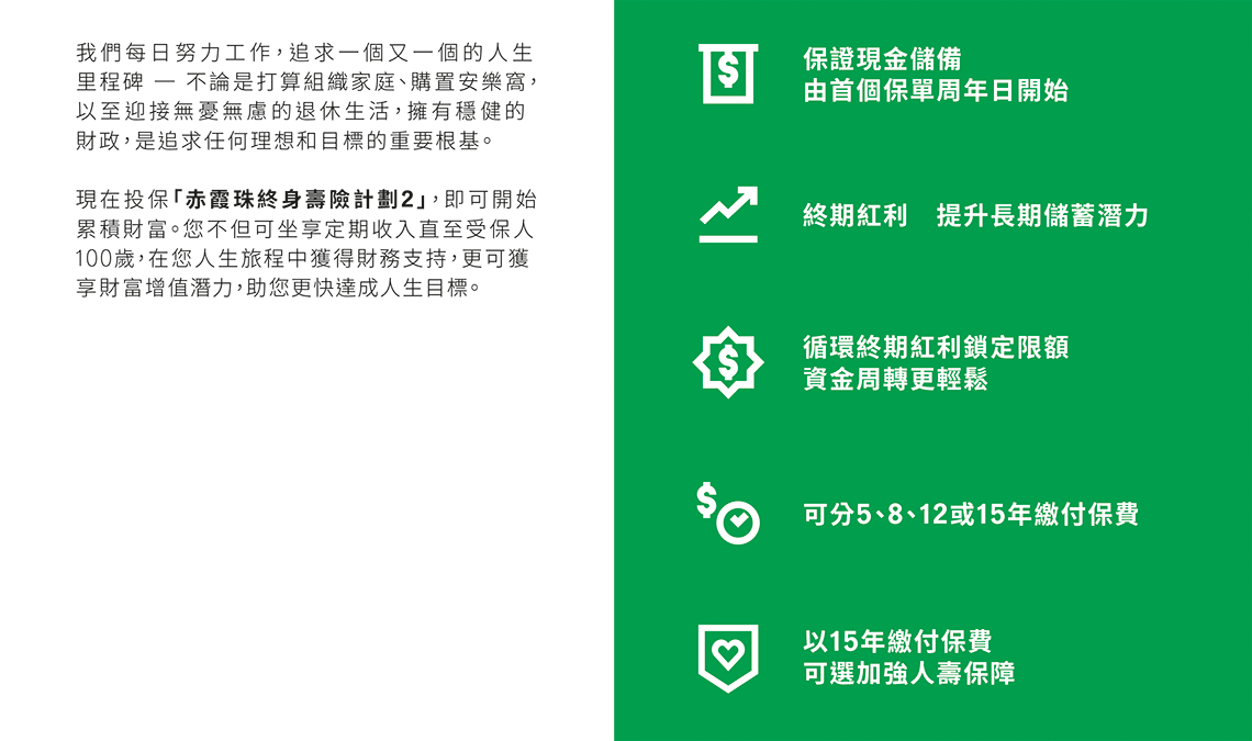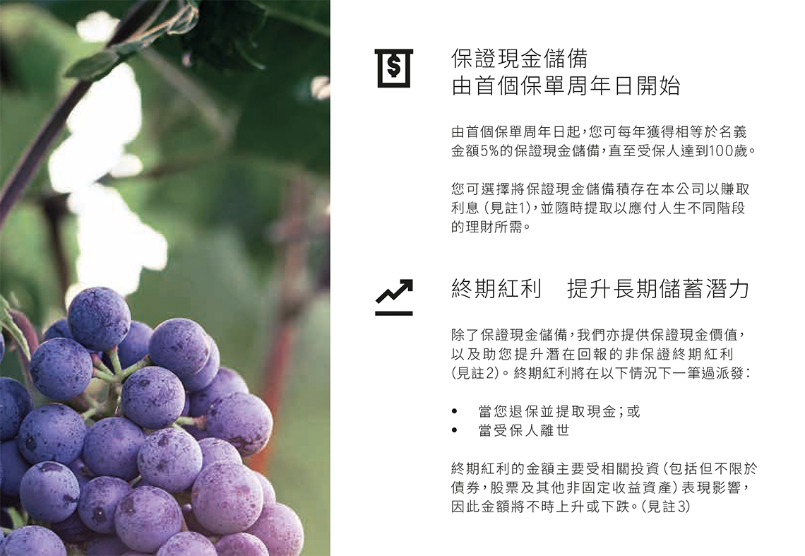 由首个保单周年日起直至受保人达到100岁,每年可获相等于名义金额5% 的保证现金储备。