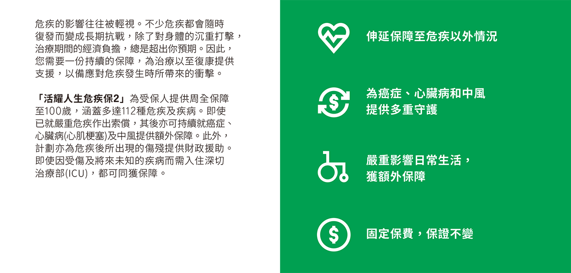 涵盖多达112种危疾:涵盖60种严重危疾包括癌症、心脏病(心肌梗塞)和中风、 44种早期危疾如原位癌及早期甲状腺癌等,以及8种儿童疾病。