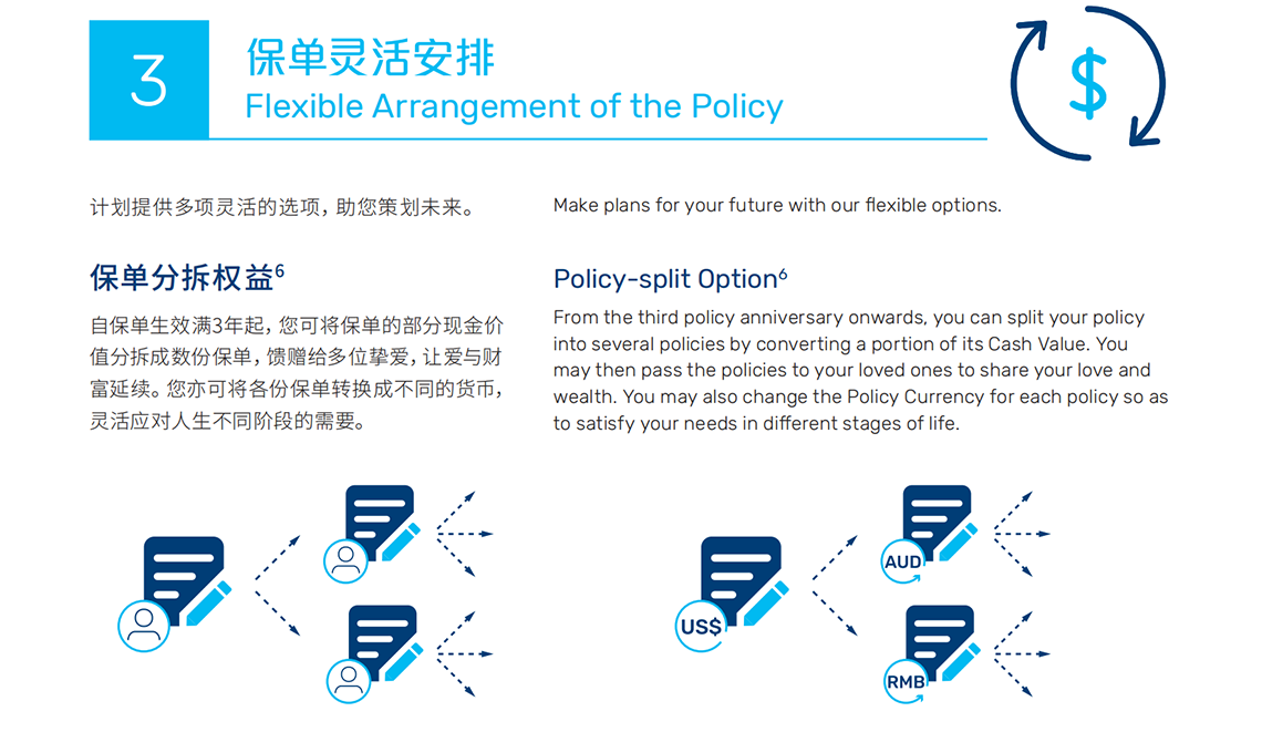 3、保单分拆权益 – 自保单生效满3年起,您可将保单的部分现金价值分拆成数份保单,馈赠给多位挚爱,亦可将各份保单转换成不同的货币