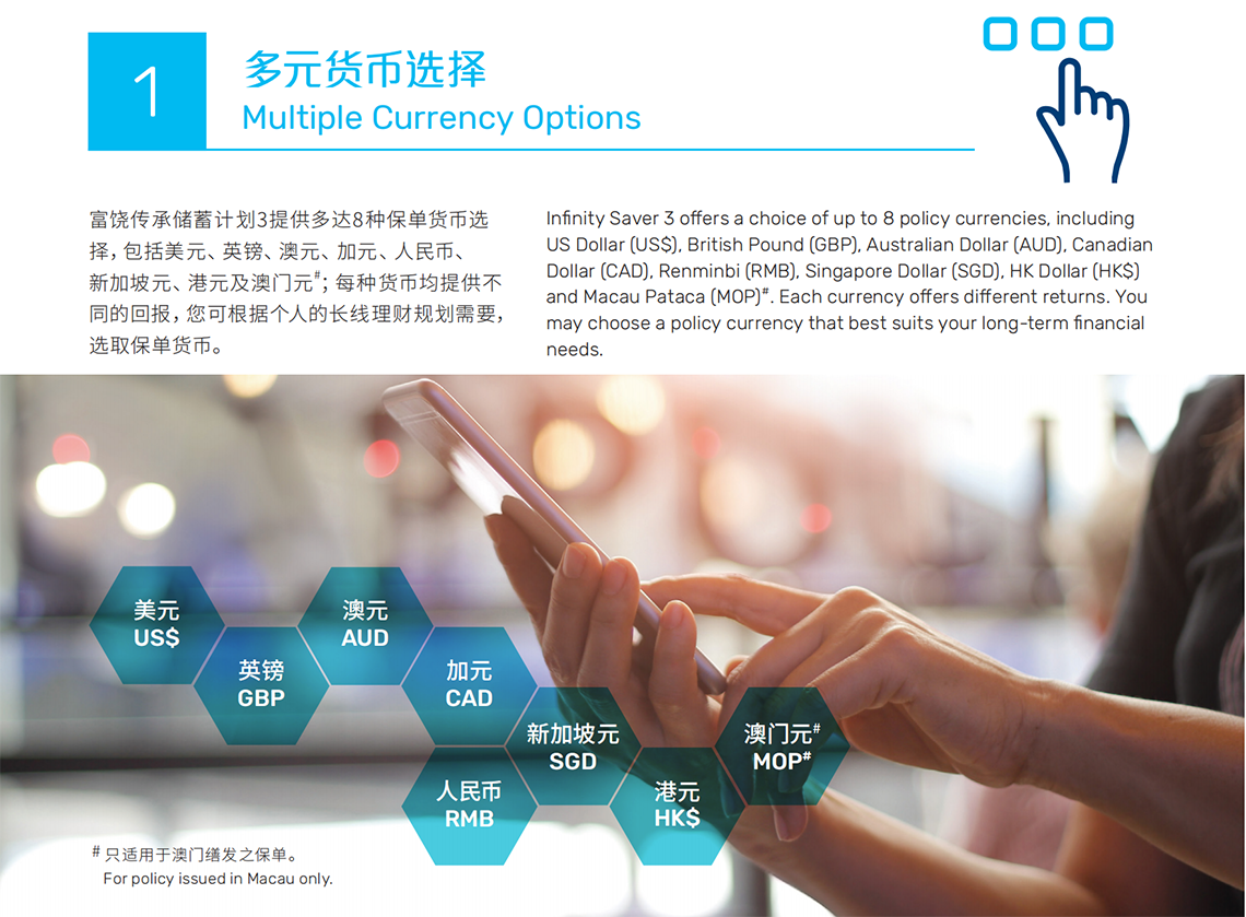 1、多达8种保单货币选择,包括美元、英镑、澳元、加元、人民币、新加坡元、港元及澳门元