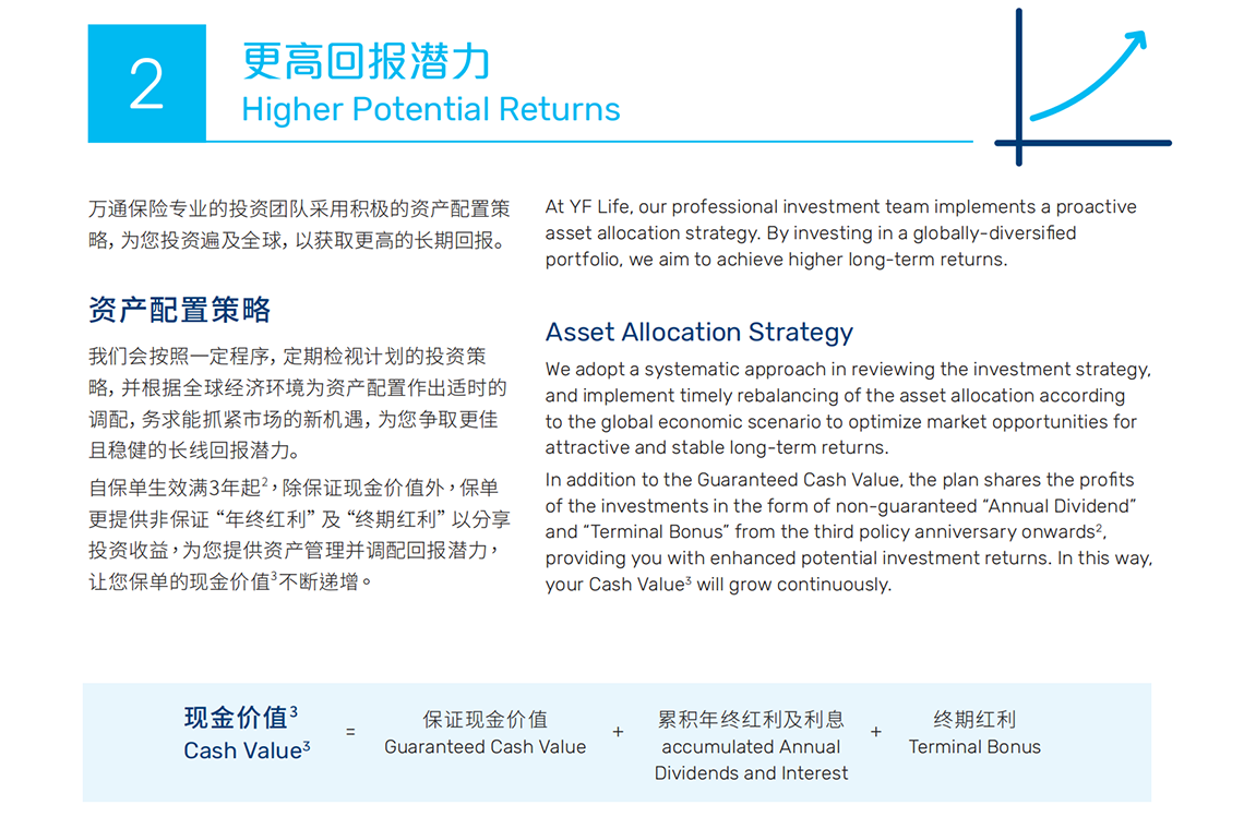 2、自保单生效满3年起,除保证现金价值外,保单更提供非保证"年终红利"及"终期红利"以分享投资收益