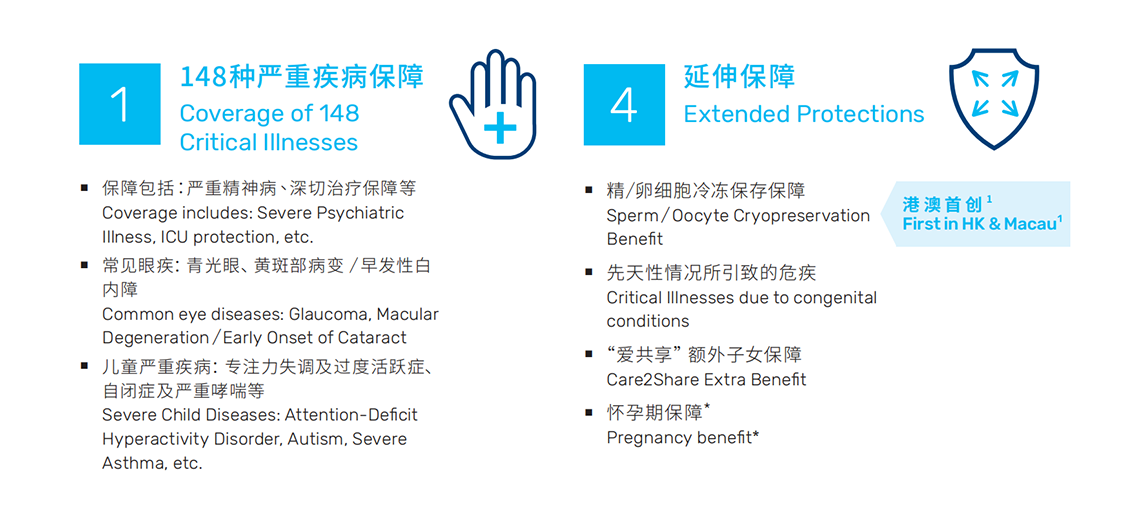 首选健康加护保承保的严重疾病多达148种,并特别为复发机会较高的癌症、心脏病及中风提供合共额外4次赔偿,以及危疾现金津贴,为您和挚爱的健康保驾护航。首选健康爱护保更让懂得未雨绸缪的您,将保障延伸至快将出生的宝宝,以爱守护孩子的健康未来。