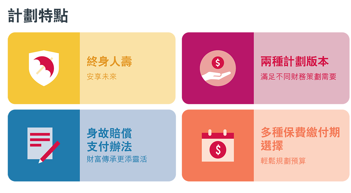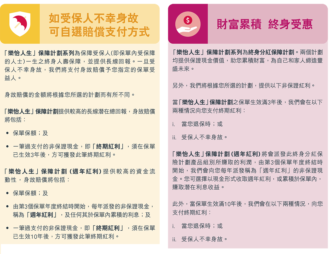 两个计划版本:「乐怡人生」保障计划以及「乐怡人生」保障计划(周年红利)具有相同保费率但不同储蓄成份,前者提供较高长线潜在回报,后者提供较高资金流动性,客户可根据个人需要作相应选择,使财务策划更灵活