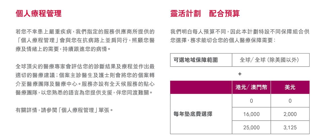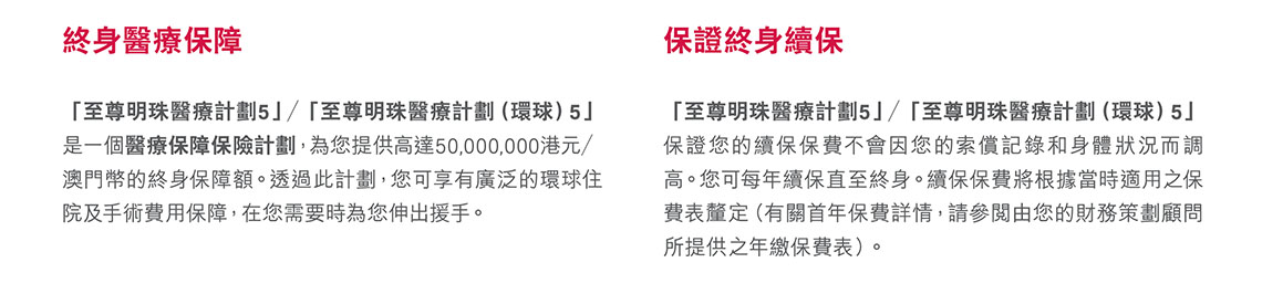 全球顶级医疗保障计划,为高净值人群量身定制,提供全球顶级医疗服务、保证终身续保且全数赔偿主要保障项目的医疗开支,个人终身赔偿限额高达5000万港币。且可与友邦高保证储蓄产品爱无忧搭配配置,以险养险,6年缴费期享有终身高端医疗保障。助您全力拼搏、乐享人生。