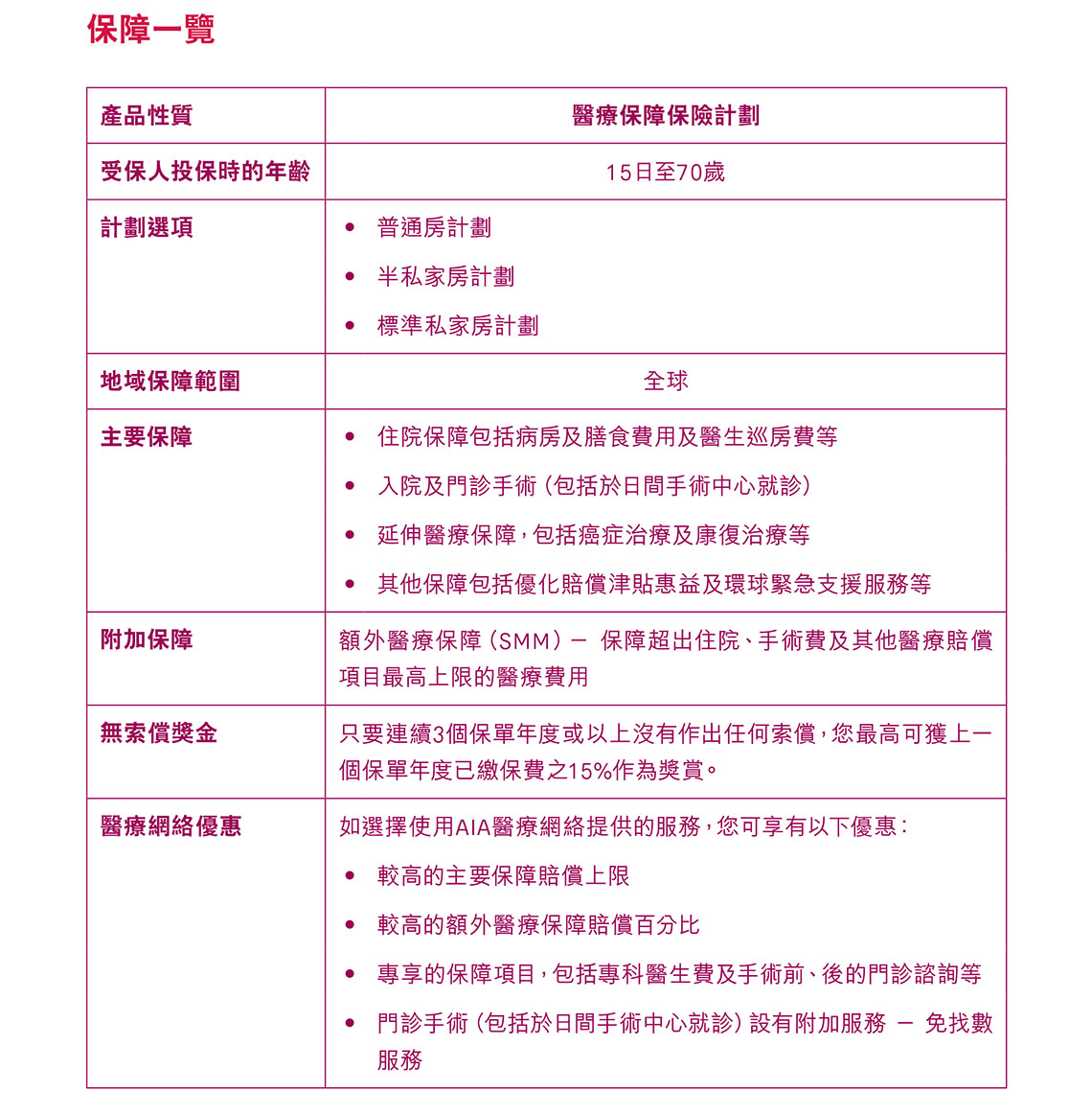 特级健康之宝2是医疗保险计划,需要附加在危疾保障或人寿保险。保证终身续保,保费不会因您的索偿记录和身体状况而调高。保费比至尊明珠低,更适合一般家庭用来抵御医疗风险。1. 在无索偿的情况下,最高可以回赠保单已缴保费15%2. 额外保障,提供医疗网络服务3. 您可以凭医疗网络卡预约,并享有面找数服务